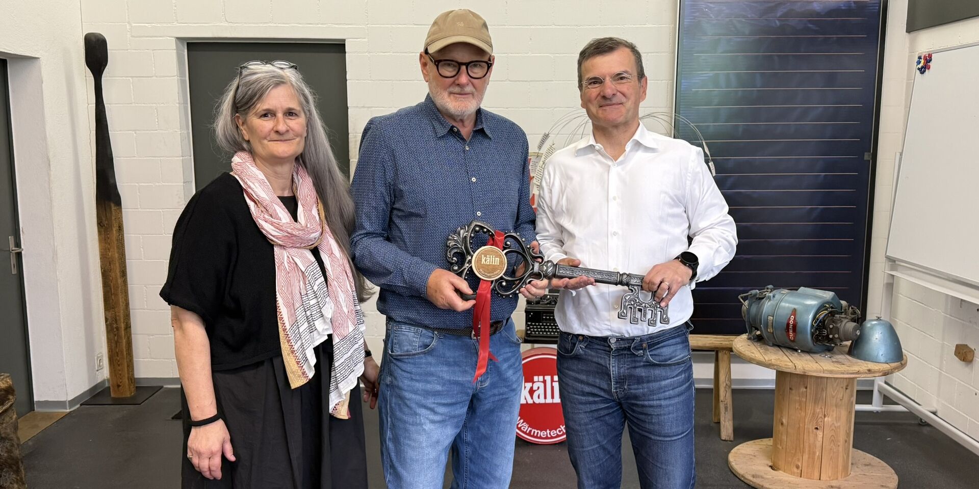 Schlüsselübergabe durch Franziska und Dominik Eggler (Geschäftsinhaber Kälin-Wärmetechnik AG) an René Schürmann (Geschäftsleiter Elcotherm AG).