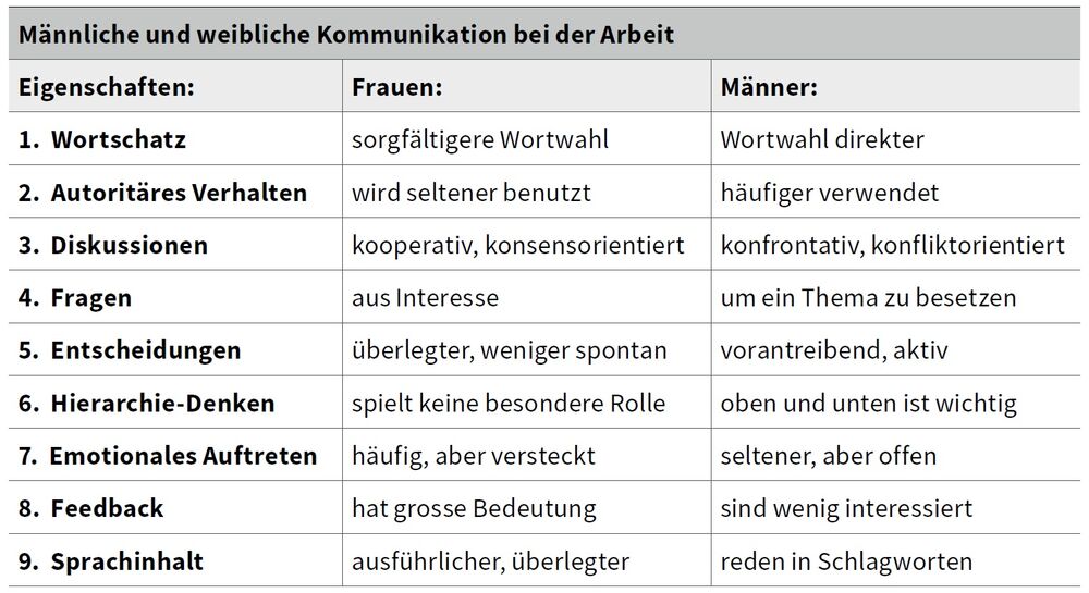 Frauen treten selbstbewusster auf als früher. Sie beweisen durch ihre Doppelrolle „Beruf und Privat“, was sie können. Männer wären in dieser Situation meist überfordert. Stark, kompetent, ehrgeizig – das weibliche Geschlecht packt an und steht den „Herren der Schöpfung“ bei der Arbeit nicht nach. Die Kollegin schafft trotzt anfänglicher Bedenken Spitzenleistungen, und das nicht nur vorübergehend in Stosszeiten. Kollegen sind überrascht, wenn Frauen die „typisch männlichen Arbeiten“ mit viel Engagement und Motivation erledigen. Tiefstapeln scheint gelegentlich noch eine weibliche Eigenschaft zu sein. Werden Frauen für ihre Arbeit gelobt, haben sie gelegentlich die Gedanken „Das hätten andere auch geschafft“. Manche denken bei ihrem Erfolg eher, dass sie nur einen Anteil daran haben oder Glück hatten. Bescheidenes Auftreten kann allerdings auch männliche Überlegenheitsgefühle provozieren. Erfreulich, dass die jüngere Generation der Frauen mit der eigenen Leistung auf sich aufmerksam macht und dem Ausspruch „Eigenlob stinkt“ eine Absage erteilt. Frauen sind schneller in der Lage, sich auf neue Gegebenheiten einzustellen. Sie sind flexibel, können sich und andere sehr gut organisieren und reagieren bei Stress und Hektik eher gelassener als männliche Kollegen. Gute Kommunikationsfähigkeiten im Team oder im Kundengespräch liegen dem weiblichen Geschlecht im Blut. Frauen haben eine ausgeprägte Gesprächskompetenz: Sie hören oft besser zu, interessieren sich für das Menschliche, denken kooperativer. Es widerstrebt vielen, sich in den Vordergrund zu stellen, während Männer dazu neigen, ihre berufliche Erfahrung auszuspielen. Männer können ihre Erfolge übertrieben betonen und sich gut verkaufen.